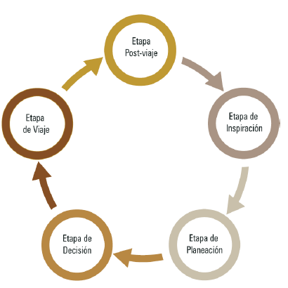 Como se puede apreciar en la figura 1, el proceso de decisión de viaje consiste en seis etapas claramente distinguibles:  inspiración, planeación, comparación, compra, viaje y aquella después del viaje. De acuerdo con la literatura especializada, las OOV  pueden tener influencia dentro de las decisiones de los viajeros a lo largo de las primeras cinco etapas, y en la última, como medio de expresión y comunicación con otros posibles interesados.