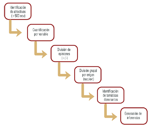 El proceso de análisis consistió en: 1) cuantificación por variable; 2) división de opiniones positivas y negativas; 3) división de grupos de opiniones nacionales y extranjeras; 4) identificación de temáticas dominantes por grupo de origen; 5) generación de inferencias; y 6) identificación de principales resultados y generación de conclusiones. Como referencia de este tipo de estudios, se revisó el de De Ascaniis y Cantoni (2017). En esta investigación se identifican y clasifican las temáticas de las OOV  aplicando un procedimiento iterativo para la definición de categorías hasta llegar a una saturación. En la figura 2 se explica de manera gráfica el procedimiento de análisis.