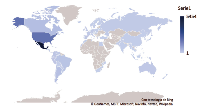 Por su parte, la figura 6 exhibe el origen geográfico de las opiniones. Como se puede apreciar, el país que domina el origen de las opiniones es México, y en segundo lugar se encuentra Estados Unidos. Otros países de importancia en América son Argentina, Brasil y Canadá. Es interesante ver en esta representación la gran diversidad de naciones donde se reporta el origen de los usuarios, desde Asia, Europa Central, Norte de África, Oceanía y Sudáfrica.