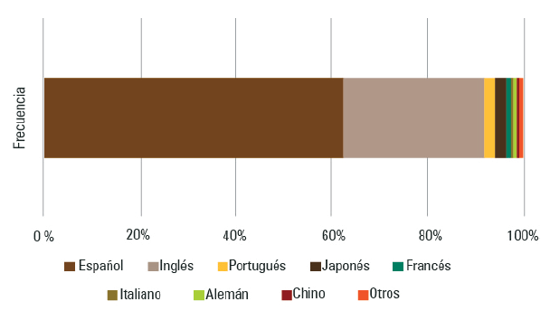 En la figura 7 se pueden ver los idiomas dominantes de las opiniones registradas y relacionadas con los diez atractivos analizados. En concordancia con la figura 7 (origen nacional de opiniones), el idioma predominante es el español, seguido del inglés. Otros idiomas con menor frecuencia en los registros son el portugués y el japonés. Cabe señalar la gran diversidad de idiomas que compone el grupo de análisis. Para analizar las opiniones que estaban escritas en idiomas con otro tipo de alfabeto y estructura gramatical (por ejemplo, coreano, neerlandés, ruso, turco y urdu), se utilizó el traductor automático de TripAdvisor. Se reconoce que esta herramienta tiene limitaciones importantes en la generación exacta de la traducción, sin embargo, gracias a ella se pudieron extraer las ideas generales y algunos significados de los textos.