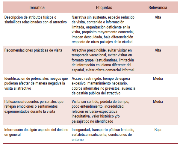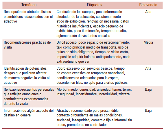 Otro de los intereses principales de esta investigación era identificar, además de las evaluaciones numéricas, las temáticas dominantes dentro de las OOV. A manera de ejemplo, en el cuadro 2 se muestran las temáticas encontradas en orden de importancia en uno de los atractivos peor evaluados para el grupo de turistas nacionales (Museo de las Momias). A pesar de ser uno de los atractivos principales de la ciudad y un poderoso imán de visitantes, también parece ser un sitio donde la experiencia turística no está cumpliendo con las expectativas de los interesados. El cuadro se divide en tres grandes apartados: temática, etiquetas y relevancia. Esta última fue estimada de acuerdo con el número de repeticiones dentro de las OOV. En este sentido, a mayor repetición, mayor relevancia estimada.
