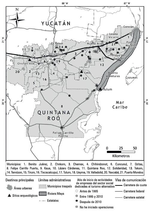 Para recabar la información primaria se aplicó un cuestionario de tipo censal integrado por 162 preguntas, del que se obtuvo información –de carácter social, cultural, ambiental y económico– de las 153 empresas turísticas en la Península de Yucatán que operan bajo una lógica de funcionamiento colectivo en escenarios comunitarios. Este mismo cuestionario fue aplicado durante el trabajo de campo realizado entre 2012 y 2016, y se hicieron los análisis correspondientes en el marco de una tesis de doctorado en geografía titulada Mayas de ayer y hoy: el papel de las sociedades locales en el desarrollo turístico de los espacios rurales (Jouault, 2018). Las respuestas  a los cuestionarios con cuatro años de intervalo, así como la evolución de la región entre 2012 y 2016, permitieron analizar la relación entre las sociedades locales y la operación de las actividades turísticas en una región denominada traspaís de Cancún-Riviera Maya, a través de las empresas  sociales que se dedican al turismo alternativo. Empleamos el sincretismo metodológico, una aproximación tanto cuantitativa como cualitativa, basada en una escala temporal de seis años –entre 2012 y 2018–, que incluyó: revisión bibliográfica en torno a entradas tales como turismo alternativo y región turística; censo de empresas sociales a través de encuestas aplicadas entre 2012 y 2016 en la región del traspaís Cancún-Riviera Maya; elaboración de mapas temáticos a partir de bases de datos organizadas y de sistemas de información geográfica; etnografía, incluyendo observación participativa, realizadas durante una estancia de nueve meses  en dos pueblos maya-hablantes. El primero de ellos, Ek Balam, de construcción reciente y cercano al sitio arqueológico homónimo; el segundo, Yokdzonot, ubicado a diez kilómetros de Chichen Itzá.