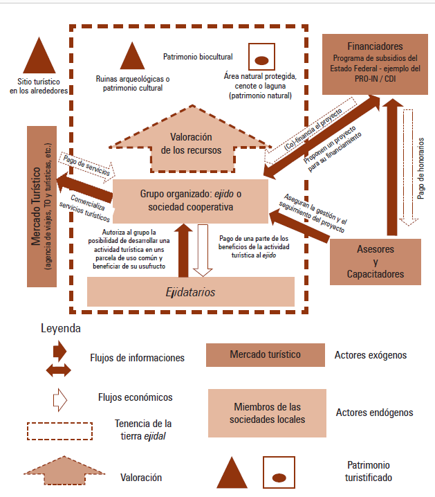 El modelo presentado (figura 2), es un esquema simplificado de las interacciones entre actores, permite rendir cuenta de las fuertes tendencias observadas en diferentes pueblos del traspaís Cancún-Riviera Maya. El grupo de ejidatarios que conforma la empresa social bajo diversas figuras jurídicas se encuentra en el corazón del modelo, y entreteje relaciones con el resto del ejido. Es el comisario ejidal, supuestamente orientado por la asamblea ejidal –es decir, la mayoría absoluta o relativa de los ejidatarios–, quien dará luz verde para el uso y el usufructo de los recursos patrimoniales ubicados en el seno del ejido. Muchas veces en acuerdo con la turistificación del patrimonio, el ejido percibirá 10% de los ingresos brutos vinculados a la actividad turística. Los actores exógenos, tales como los financiadores –programas de subsidios del gobierno federal mexicano– y los consultores, son clave para la comprensión de esta turistificación. El mercado turístico es muchas veces ilusorio por varias empresas  sociales. Numerosas empresas  reciben una cantidad mínima de turistas.  Cabe mencionar que este modelo es válido si los recursos patrimoniales son ubicados en un ejido donde existe el régimen de uso común. Cuando parte o todo el ejido fue parcelado, los recursos patrimoniales ubicados en esta parcela pertenecen al ejidatario o avecindado, y en consecuencia la asamblea ejidal pierde el derecho sobre los usos de dicha parcela.