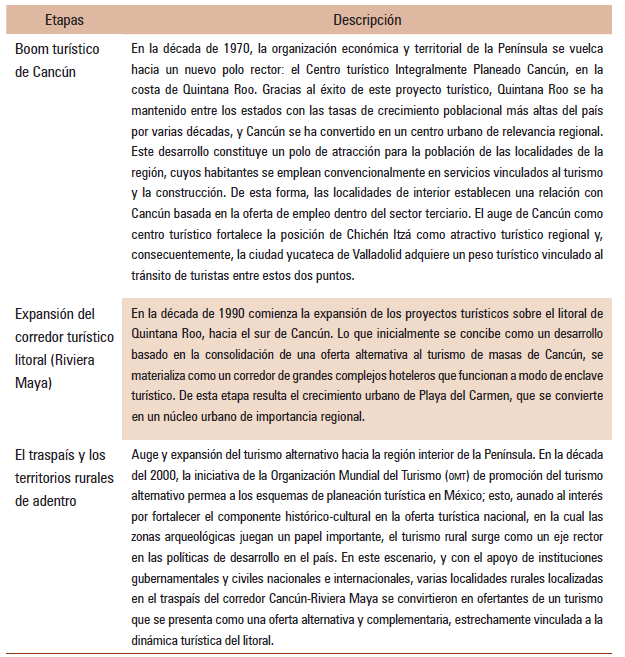 La región turística del traspaís de Cancún-Riviera Maya se inscribe en el desarrollo regional de la Península de Yucatán y sus diferentes etapas: la creación de Cancún en el principio de los años setenta  y la consolidación del destino en los ochenta; la expansión del corredor turístico de la Riviera Maya hacia el sur; y por fin, la turistificación del territorio hacia el interior (cuadro 2).