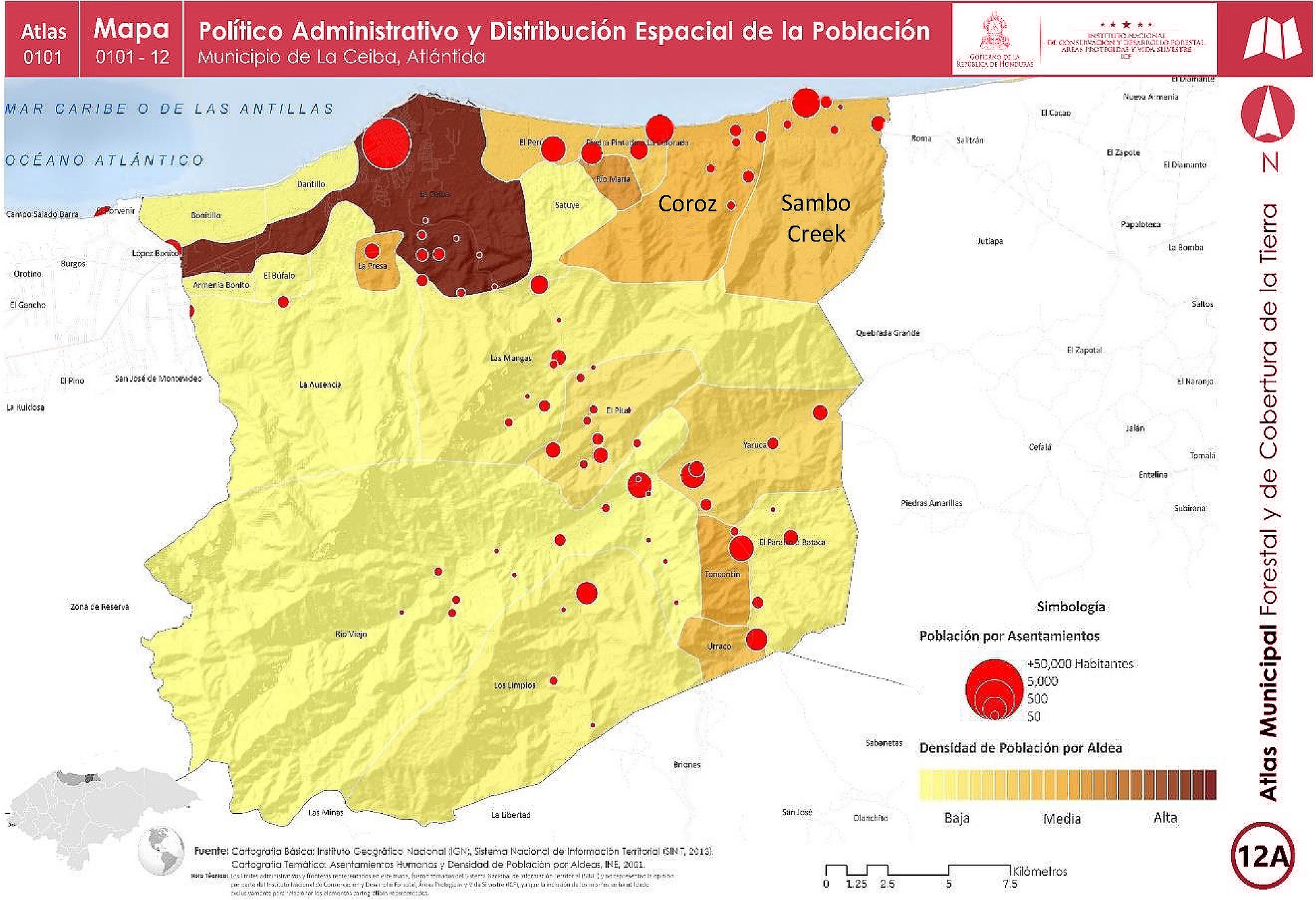 Figura 1. Mapa político administrativo y distribución espacial de la población de La Ceiba