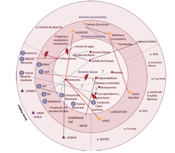 En cuanto a relaciones de conflictos, se evidencian las confrontaciones entre: SERNA y las Juntas de Agua por asuntos ambientales; DIGEPESCA y los pescadores por las zonas geográficas y métodos empleados al pescar; el SAR ejerce presiones sobre los emprendedores locales para lograr la formalización de sus negocios; la Fundación Cayos Cochinos y los lancheros mantienen relaciones de confrontación, producto de malas prácticas en las operaciones de estos últimos. El análisis de las relaciones comunitarias está esquematizado por medio de la siguiente figura.
