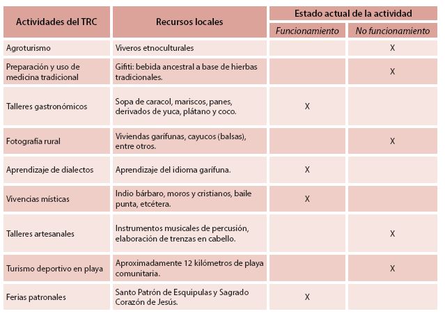 Acorde con los resultados del grupo focal, se reconoce que las comunidades cuentan con diversas actividades y recursos apropiados para ser aprovechados desde el TRC. Se identifica una riqueza del patrimonio cultural, exteriorizada a partir de danzas, vestuarios, manifestaciones religiosas, lengua ancestral y gastronomía. Existen actividades como el etnoturismo, fotografía rural, aprendizaje de dialectos, vivencias místicas y otras (SECTUR, 2004), que en contraste al producto de sol y playa no han tenido relevancia notoria.