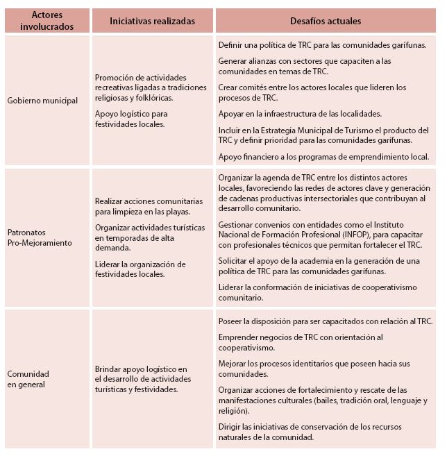 A continuación, se presenta la tabla 3, que describe los intentos que actualmente hacen los actores locales, como iniciativas para promover el TRC; asimismo, se introducen algunos desafíos en torno a las condiciones que imperan actualmente sobre estas comunidades.
