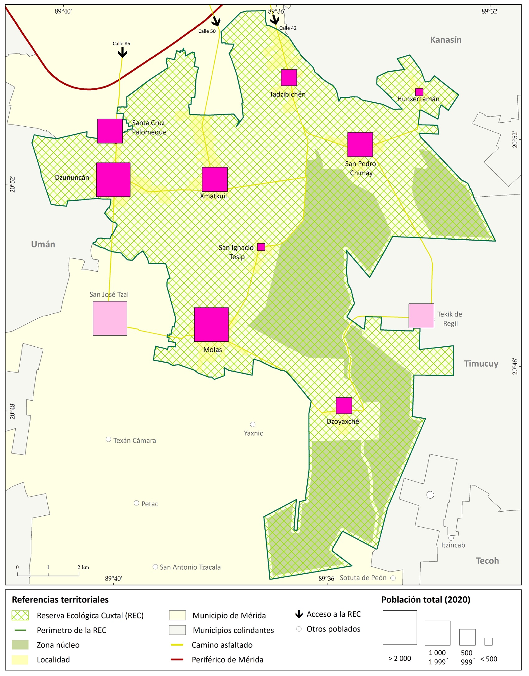 La Reserva Ecológica Cuxtal (REC) es un área natural protegida con una superficie de 10 mil 757 hectáreas, fue decretada el 14 de julio de 1993 bajo la categoría “sujeta a conservación ecológica”, dentro del municipio de Mérida. La REC limita al Norte con la ciudad de Mérida, al Este con los municipios de Kanasin y Timucuy; al Sur con las comisarías Yaxnic y Texán Cámara y al Oeste con el municipio de Umán (figura 1). A su vez, destaca que diez colonias de la ciudad de Mérida se ubican dentro de su polígono y nueve son las comisarías que comprenden su territorio, entre las que se encuentran Xmatkuil, Tahdzibinchén, San Pedro Chimay, Hunxectamán, San Ignacio Tesip, Dzoyaxché, Molas, Dzununcán y Santa Cruz Palomeque (García-Gil et al., 2020).