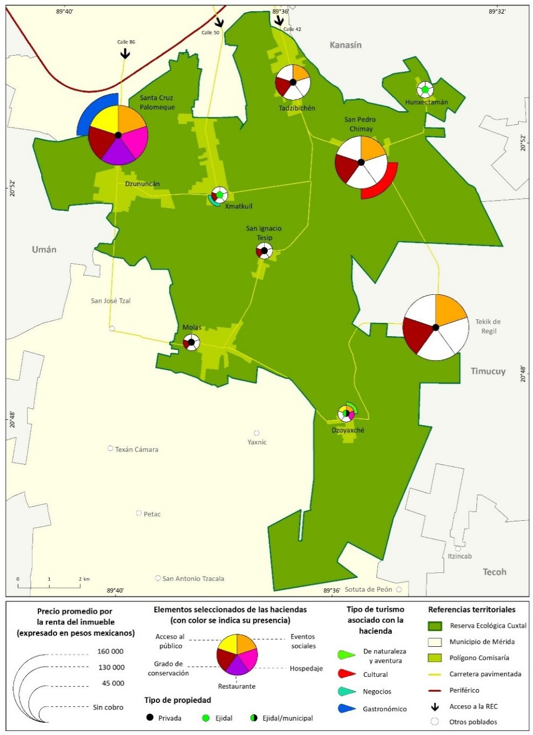 Al respecto, Gutiérrez et al. (2011) identificaron 51 edificaciones en el municipio de Mérida, aunque en este trabajo se consideró incluir la hacienda de Hunxectamán. De este modo, ocho de las 52 haciendas inventariadas se localizan en la zona Sur, lo que evidencia que más del 15% del patrimonio arquitectónico-industrial henequenero de Mérida se ubica en la REC. Esto manifiesta su importancia como recurso turístico-patrimonial e influencia en la organización territorial del turismo de haciendas al interior de la reserva.