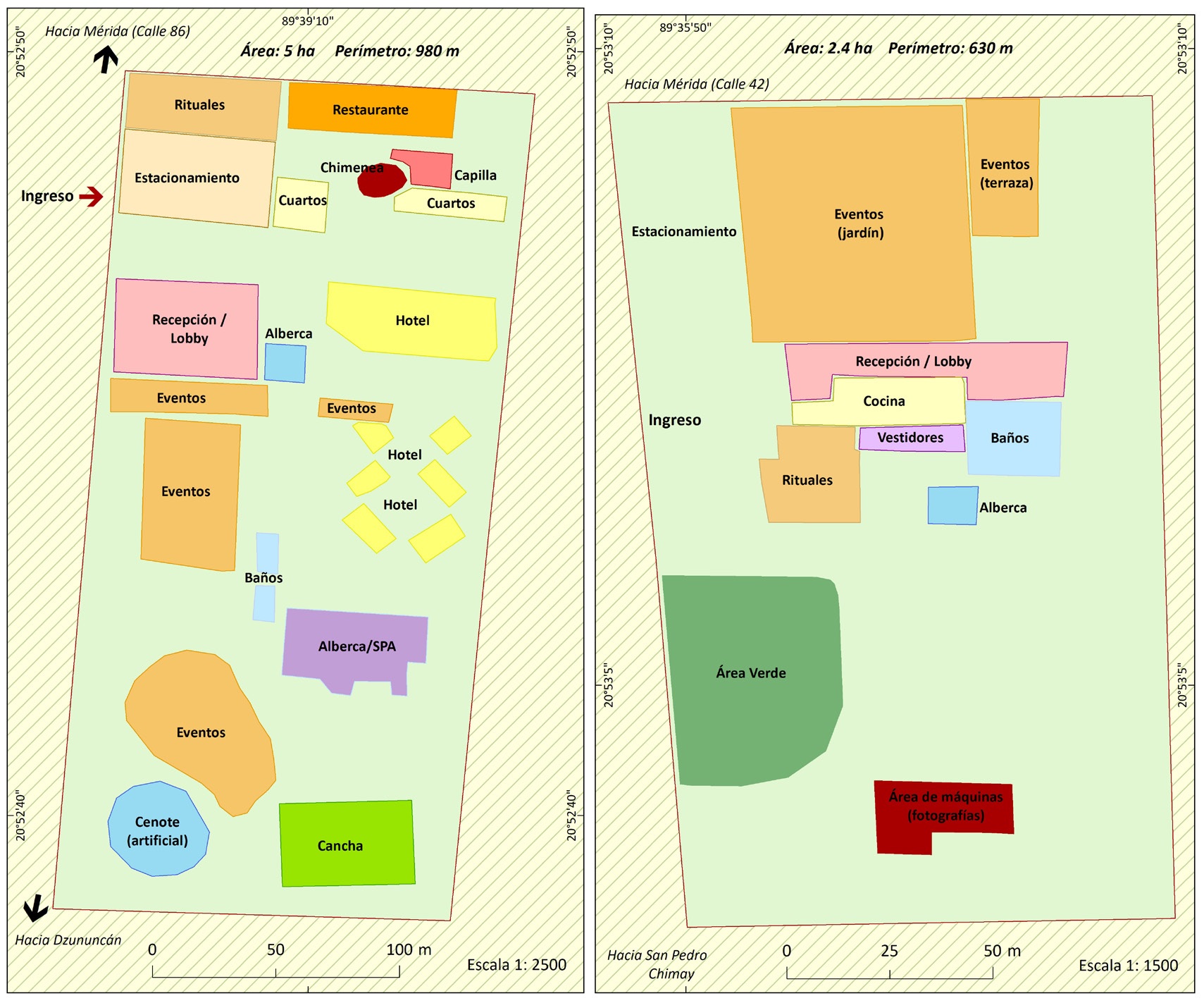 A. Hacienda Santa Cruz Palomeque. B. Hacienda San Antonio Tadhzibinchén. Se realizó con base en la visita hecha a las instalaciones y en imágenes de satélite.
