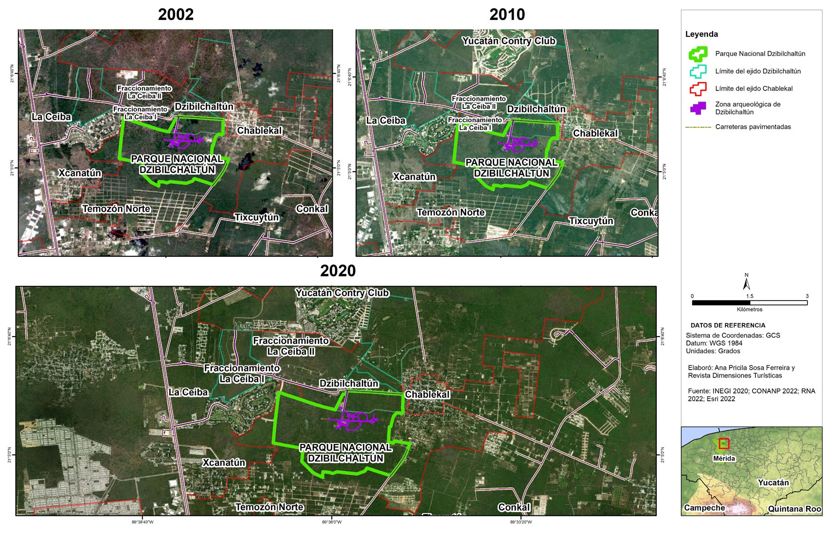 Los ejidos de Dzibilchaltún y de Chablekal, así como su ejido vecino de X’Kanatun, además de albergar en parte de su territorio al Parque Nacional (PND), están actualmente rodeados de fraccionamientos cerrados, de lujo y están en construcción otros fraccionamientos más (Ver figura 3 y Semarnat, 2021). La ciudad de Mérida se encuentra en una dinámica de metropolización a costa de los ejidos cercanos. Bolio (2016) explica cómo a partir de la puesta en marcha del Procede, se aceleró esta expansión horizontal, de ciudad difusa, dispersa y desconectada, cambiando los usos de suelo o ignorándolos, tanto en áreas elegidas para vivienda de lujo como para vivienda de interés social en el sur y oriente de Mérida. Para satisfacer ese ritmo de construcción, otras zonas de la periferia de Mérida fueron convertidas en bancos  de materiales. La figura 3 muestra la expansión de la zona urbana de Mérida en las últimas décadas.