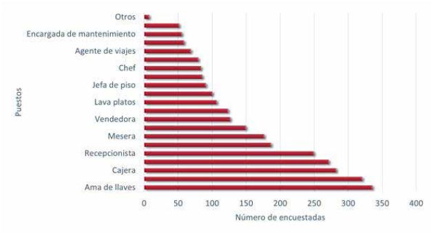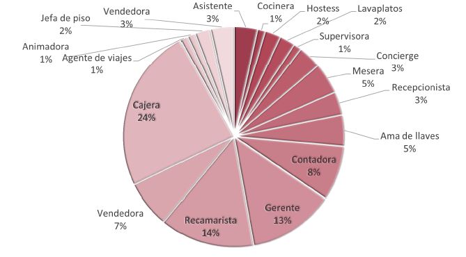Por ejemplo, se registraron 174 mujeres que tienen menos de un año de haberse incorporado al trabajo en las empresas de servicios de hospedaje, 19% son cajeras, 18% son recepcionistas y 13% son meseras. De los puestos administrativos menos ocupados por estas mujeres son jefa de piso con 1% y gerente con 2.3% (ver Figura 3).