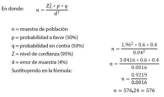 La muestra se obtuvo a partir de la fórmula para poblaciones infinitas, esto se debe a la carencia de datos específicos sobre la dinámica laboral en el sector del turismo en este destino. El instrumento se aplicó a una muestra de población de 576 empleadas, obteniendo dicha muestra a partir de la fórmula estadística para población infinita, utilizando un margen de error del 4%. La fórmula utilizada fue la siguiente: