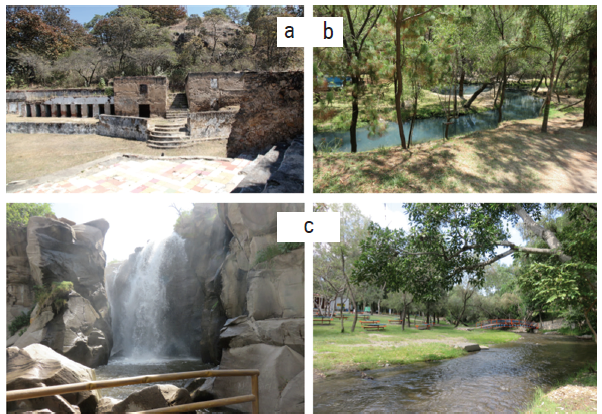 Figura 5. Recursos localizados en el área de la SLP con función turístico-recreativa: a) Vestigios de la Hacienda La Primavera, pionera de las prácticas turístico-recreativas; b) Rancho-Camping Agua Dulce; y c) Balneario Los Chorros de Tala.