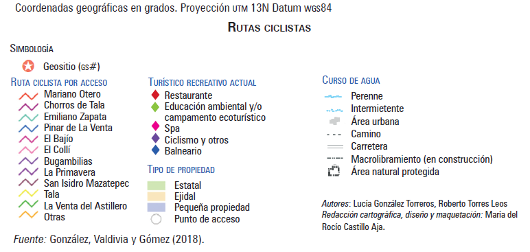 La información que se ofrece sobre las rutas tiene que ver con longitud, pendiente, clima, grado de dificultad e interés; además se mencionan en blogs y en páginas web de pequeñas empresas que ofrecen un turismo alternativo. Sin embargo, las quejas de los dueños de los predios también van en aumento. En la figura 6 se presentan las distintas rutas ciclistas, según el punto de acceso; se han relacionado con la localización de los geositios para evaluar su coincidencia espacial. Como se observa, los puntos de mayor riesgo son nacimientos de agua caliente y algunas zonas de chimeneas fósiles apiladas, pero en particular los domos de San Miguel y Las Planillas. La figura también muestra el tipo de propiedad de los predios en los cuales se manifiestan estas prácticas, así como la localización de sitios con actividad turístico-recreativa actual.