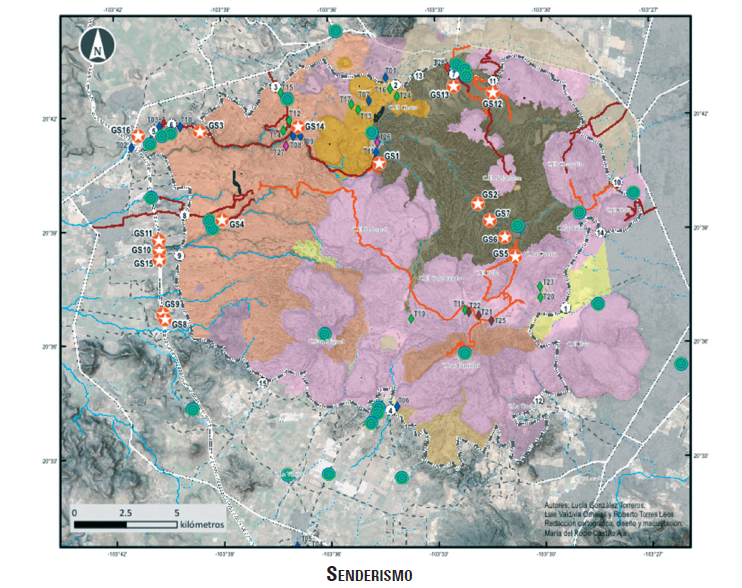 Con la creciente demanda como espacio recreativo, la afluencia a La Primavera se ha intensificado, lo que provoca una problemática mayor y la necesidad de establecer líneas de acción orientadas a generar las condiciones para un control más eficiente de los flujos temporales. Por ejemplo, el acceso desde el poblado de Tala no cuenta con un ingreso controlado ni un conteo, pero resulta de gran importancia para actividades como el camping y el pícnic. En cuestión del patrimonio geológico, este es uno de los accesos de mayor relevancia por la localización de puntos de interés geológico identificados en campo. En la figura 7 se exponen los trazos de los senderos, combinándose con la localización de geositios y de puntos de observación del paisaje así como con los emprendimientos turísticos y con la capa de unidades de relieve, entre las que destacan los lomeríos, las barrancas y las zonas de chimeneas fosilizadas, coincidentes con buen número de geositios.