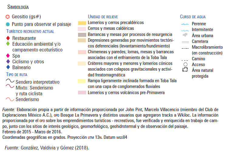 The geological value of the Sierra La Primavera (SLP), adjacent to Guadalajara’s Metropolitan Area, Jalisco, has remained ignored for many years. However, in the past few decades, —ever since the 19th century—, the thermal waters, —being a geohydrothermal element—, and the forest, have gained attention for recreational activities. Taking as a reference the study coordinated by González, Valdivia and Gómez in 2018, —Volcanic Geodiversity and geological heritage of Sierra La Primavera (Geodiversidad volcánica y geopatrimonio en la Sierra La Primavera)—, it has been possible to identify, document and evaluate the geodiversity and its potential to be considered heritage, focusing on those that can be considered important for geoturism practices, which are an important resource for local development. This geodiversity is the result of a 140-thousand-year volcano-lacustrine evolution that has determined the actual landscape and its worth for activities such as health resorts, picnic, camping, cycling, trekking, horseback riding, ecotourism, as well as interpretative and rural tourism.