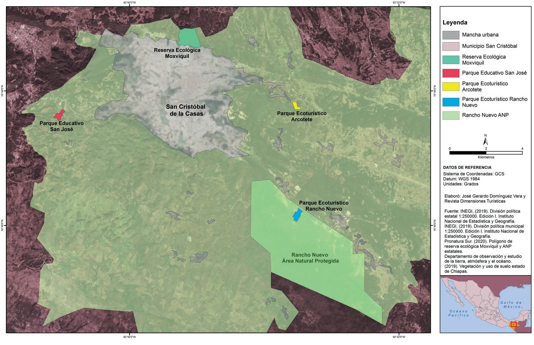 Sin embargo, existen iniciativas de ecoturismo en el municipio de San Cristóbal de las Casas, Chiapas, de las que se desconoce si cumplen con los criterios de la Norma 133. Entre ellas destacan los Parques ecoturísticos Arcotete y Grutas de Rancho Nuevo (Rancho Nuevo). De igual forma, se localizan áreas naturales protegidas privadas como Moxviquil y públicas como el Parque Educativo San José, que desarrollan actividades turísticas consideradas respetuosas del medio ambiente (ver figura 1).