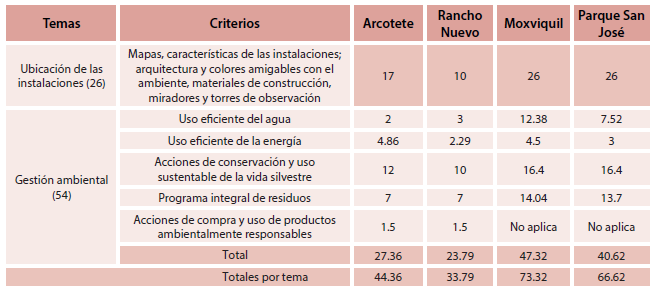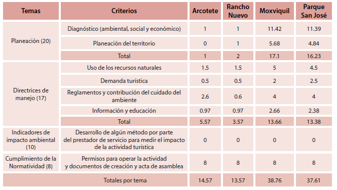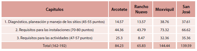 La suma de los puntajes alcanzados por sitio fue mayor para Moxviquil (38.76), seguido por San José (37.61), Arcotete (14.57) y finalmente Rancho Nuevo (13.57) (ver tabla 1). Los criterios del capítulo 1 más penalizados fueron la planeación territorial y tampoco recibió valor la estimación del impacto ambiental de la actividad ecoturística. De los cuatros sitios, el Arcotete y Rancho Nuevo no contaron con un documento de planeación que incluyera el diagnóstico para valorar los recursos naturales con los que cuentan, así como los posibles impactos por el turismo. No hubo al inicio de los proyectos una delimitación de áreas de conservación, restauración y aprovechamiento turístico. Asimismo, las construcciones y actividades no se guiaron por una planeación inicial.