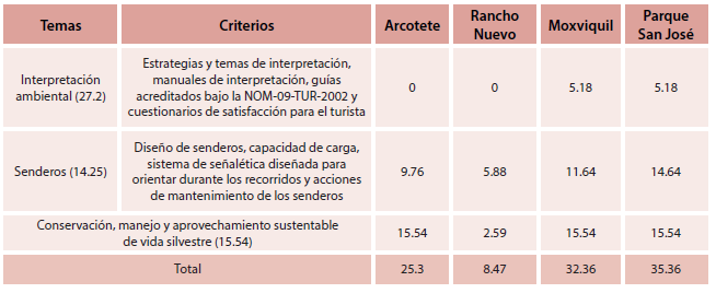 Con base en los totales obtenidos en cada sitio, los espacios aún no logran un manejo sustentable, tal como se especifica y valora en la Norma 133. Esto puede incluso sugerir una interpretación incorrecta de lo que implica un proyecto de corte sustentable en al menos dos de los sitios que se autodenominan como ecoturísticos, lo que suele suceder cuando los proyectos responden a los intereses económicos o políticos de ciertos actores, pero desafortunadamente tienen una escasa o nula visión para brindar soluciones a problemas ambientales (Manuel y Meza, 2014).