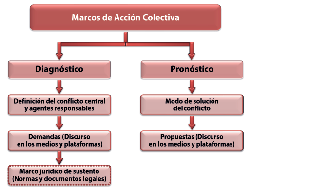 Como se mencionó previamente, Benford y Snow (2000) establecen la existencia de tres marcos centrales de acción colectiva: el marco de diagnóstico, el de pronóstico y el de motivación. El primero remite a la identificación del conflicto y a los agentes responsables de la situación. El segundo se refiere a la propuesta para la solución de la situación de injusticia previamente identificada, formula un plan y las estrategias para llevarlo a cabo. Los autores explican que es en este marco donde pueden observarse las mayores diferencias entre las organizaciones que componen un movimiento. Finalmente, el marco de motivación incluye la justificación que hace necesaria la participación de la población para modificar la realidad.
