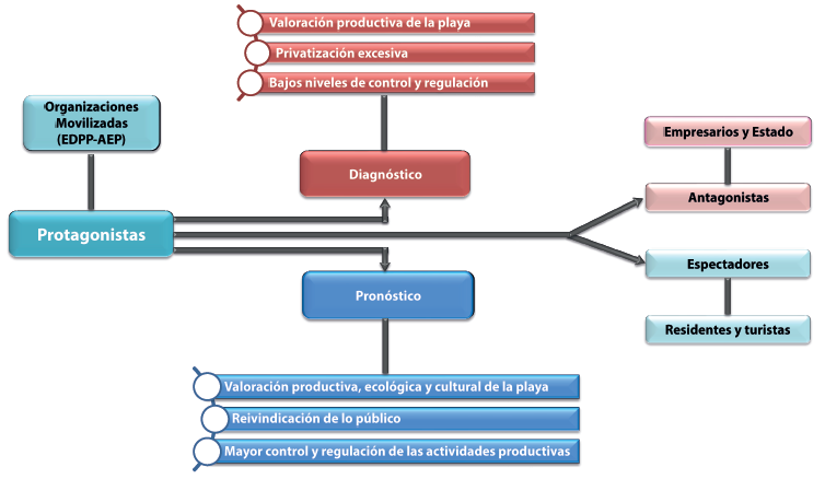 La correlación a los campos de identidad implica la asignación de determinados roles a los actores que se encuentran involucrados en la problemática abordada. En primer lugar, el grupo protagonista está compuesto por las organizaciones previamente descritas. Es relevante considerar que la identificación de los protagonistas se construye, en cierta medida, a partir de la diferenciación con los otros. En este caso los otros, los antagonistas, representan una visión que se opone al discurso de los actores movilizados, con respecto a la valoración de la playa. Los antagonistas son referenciados principalmente en el marco de diagnóstico.