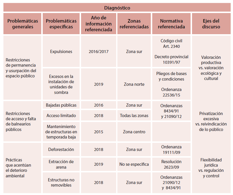 Estas prácticas de restricción a la permanencia se observaron en el sur de la ciudad de Mar del Plata, donde los balnearios se emplazan en terrenos privados. Ante esta circunstancia, el reclamo se sustenta en lo establecido en el artículo 2340 del Código civil argentino (Ministerio de Justicia y Derechos Humanos, 2014) y en el decreto provincial 10391/87.