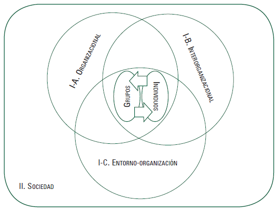 En la figura 1 se representan las relaciones entre estos diferentes niveles y dimensiones teóricas. Con números romanos se consignan los dos niveles de abstracción: el organizacional (I), al que puede denominarse nivel o ámbito de las teorías especializadas, específicas o aplicadas, y el metateórico (II), al que puede llamarse también ámbito de las teorías generales. Es posible ver asimismo las distintas dimensiones que abordan las teorías especializadas: la A, intraorganizacional; la B, interorganizacional, y la C, entorno-organización, así como todas las posibles combinaiones entre niveles y dimensiones: IA+IB, IA+IC, I+II, IA+IB+IC, etcétera.