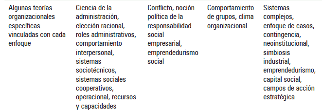 El resto de los enfoques ha incidido en menor medida en la generación de teorías influyentes en el ámbito de los estudios organizacionales, sin embargo, pueden identificarse algunas con las características de cada uno de los tres enfoques.