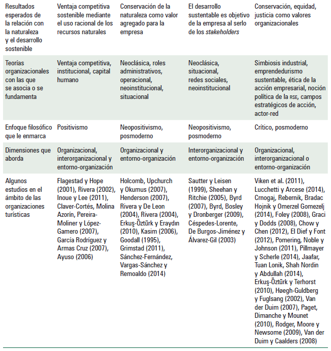 An analytical review of the abundant academic production on organizational and administrative theories that have been developed from 1970 to 2014 to explain and frame the studies of tourism enterprises and their relationship with the natural environment and sustainable development is presented. The main finding shows that the mainstream focuses on corporate social responsibility theories (csr) and is framed in a positivist approach while other theoretical philosophical approaches were identified.