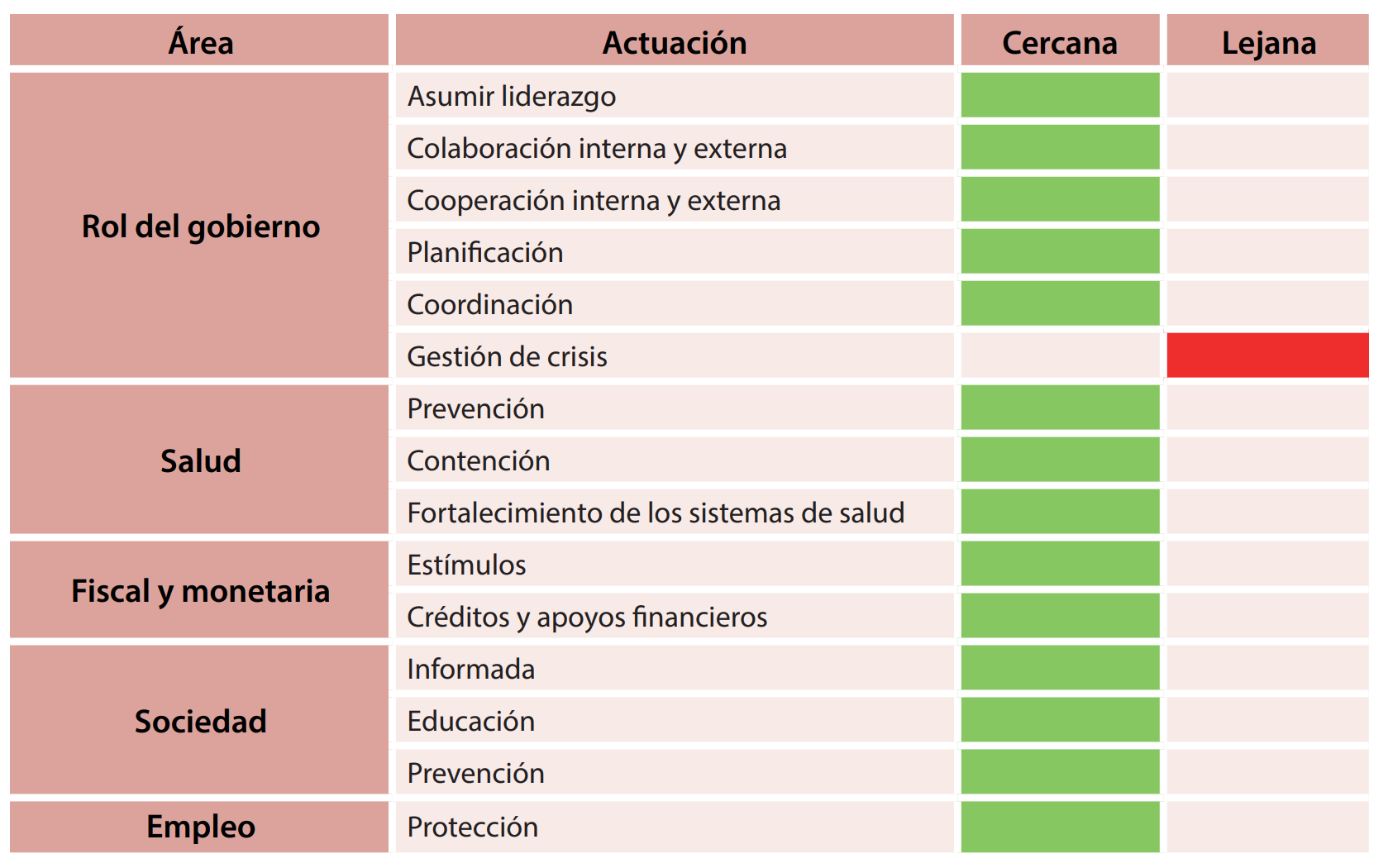 Los esfuerzos, en su mayoría, se han centrado en la limitación de la movilidad, el aislamiento y la suspensión de actividades (exceptuando las esenciales), paquetes financieros de ayuda, fortalecimiento de sus sistemas de salud, además de realizar protocolos de higiene y limpieza, por mencionar algunos. En ese sentido, los resultados del comparativo entre las recomendaciones y la implementación de políticas muestran una clara concordancia y cercanía con las sugerencias internacionales.