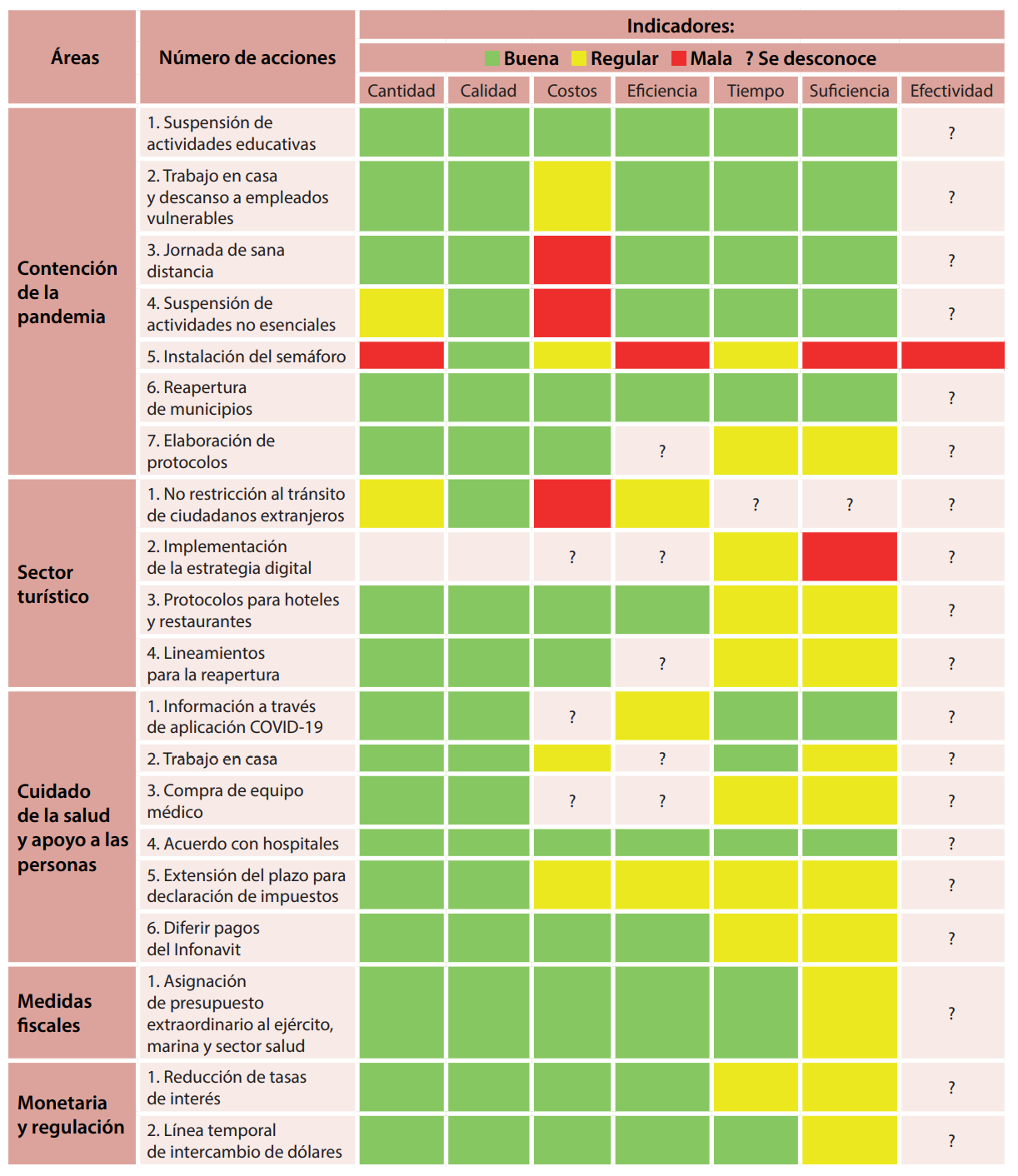 Una vez contrastados, mediante un semáforo se clasificaron en rojo los que se consideraron como no aceptable, amarillo como regularmente aceptable y verde aceptable, este ejercicio permitió obtener como resultado la cualificación de las acciones implementadas y un panorama situacional de la política pública ante el COVID-19 y el turismo.