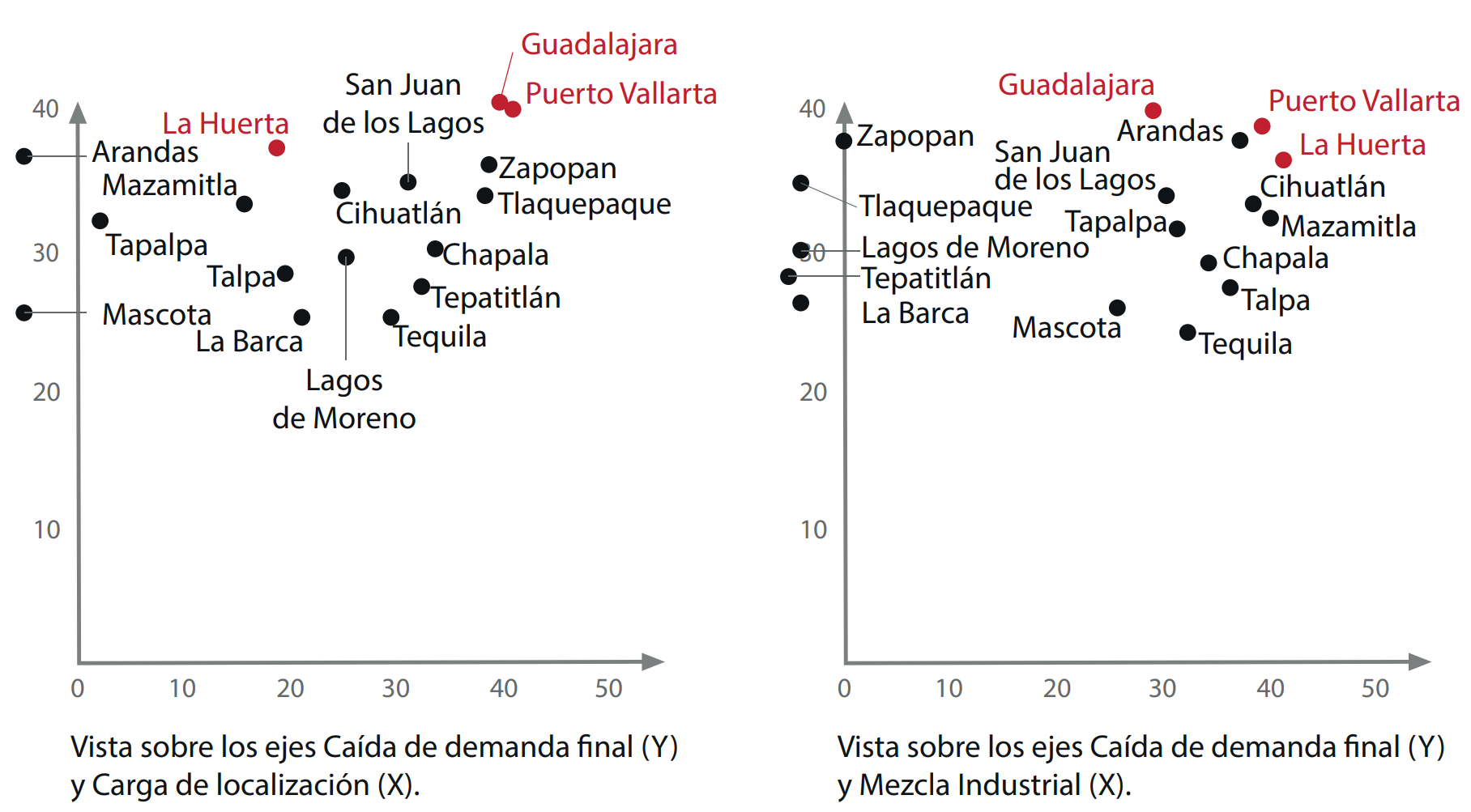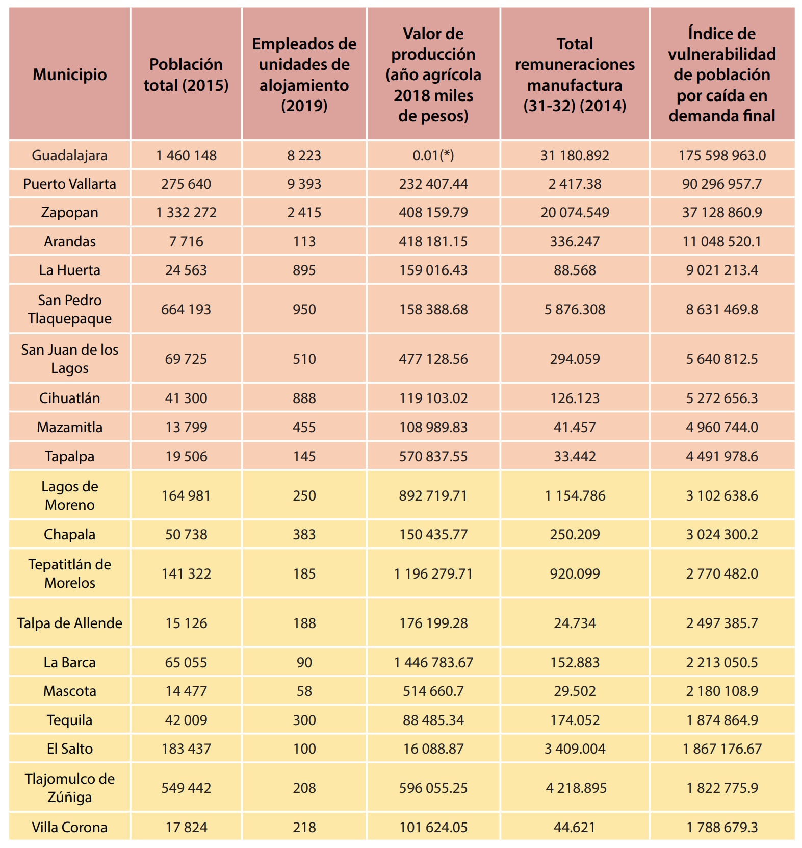 En este caso, las economías locales más vulnerables son las metropolitanas, con Puerto Vallarta a la cabeza, seguido de seis municipios de la zona metropolitana de Guadalajara y tres ciudades medias, una de las cuales (Chapala) es también uno de los lugares con más turismo y retirados extranjeros en el estado de Jalisco. Además de estos lugares, destacan en la tabla de los 25 municipios más vulnerables, centros turísticos como Tequila, San Juan de los Lagos, Talpa de Allende, Cihuatlán y la Huerta.