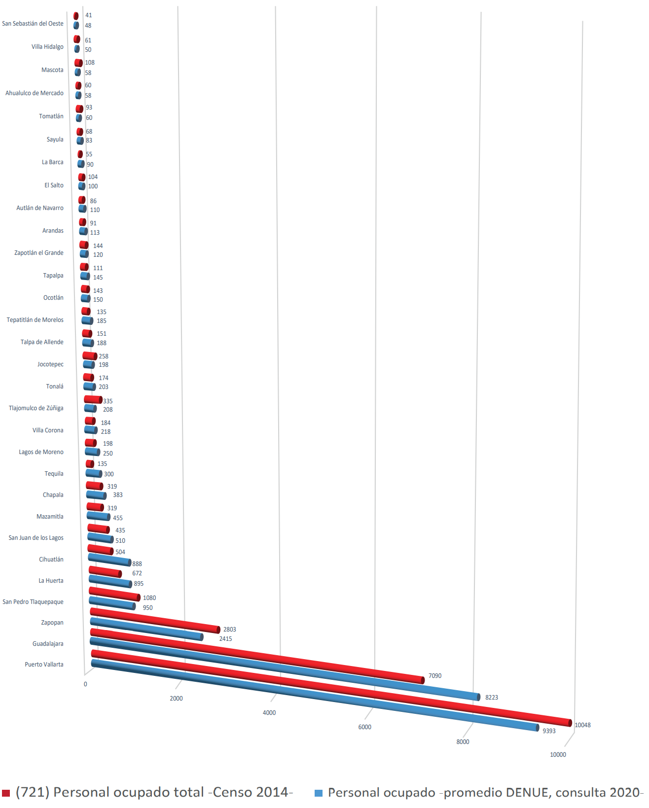 Los 30 municipios que se muestran en la tabla 1 concentran el 86% de los establecimientos de hospedaje y el 95% del personal ocupado. La oferta de hospedaje y sus efectos multiplicadores en el resto de la economía de los municipios se concentran en seis municipios: Puerto Vallarta, 33%; Guadalajara, 29%; Zapopan, 9%; San Pedro Tlaquepaque, La Huerta y Cihuatlán 3% cada uno; el resto de la entidad tiene el 20%.