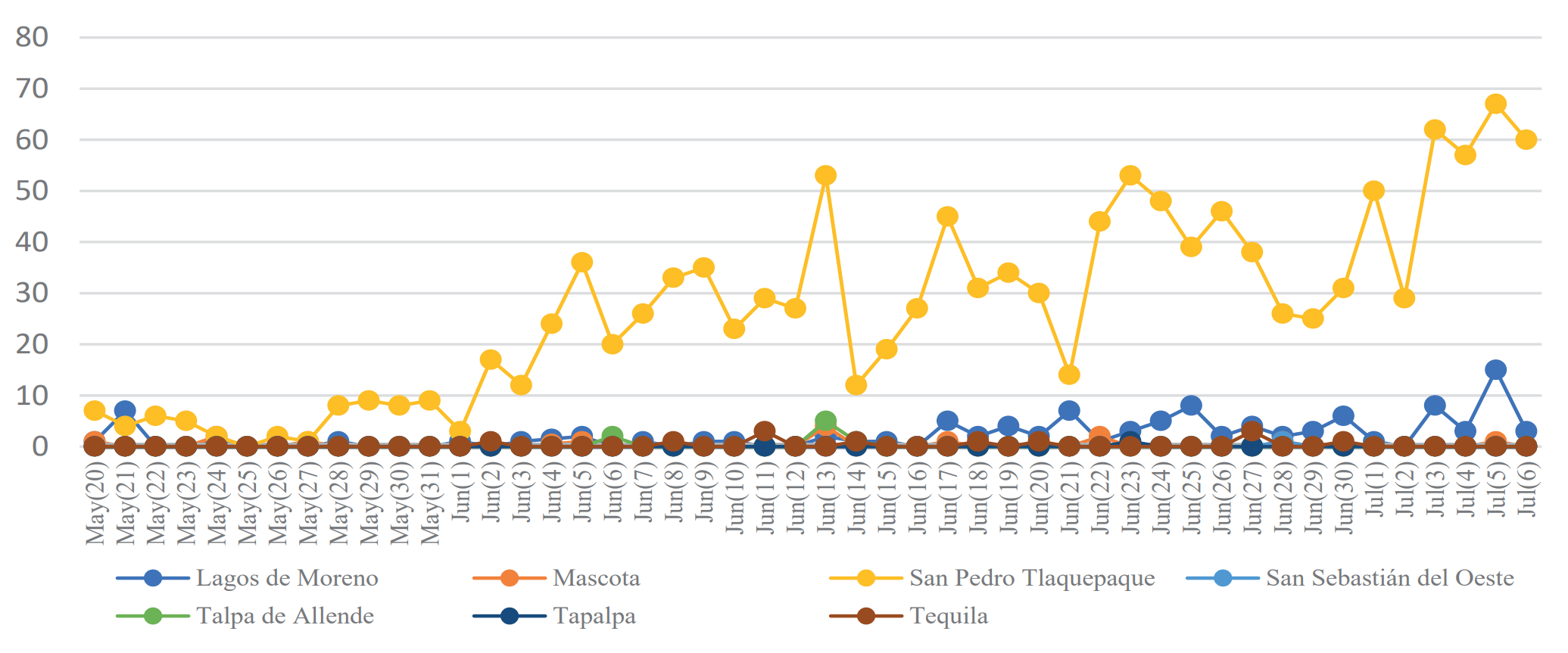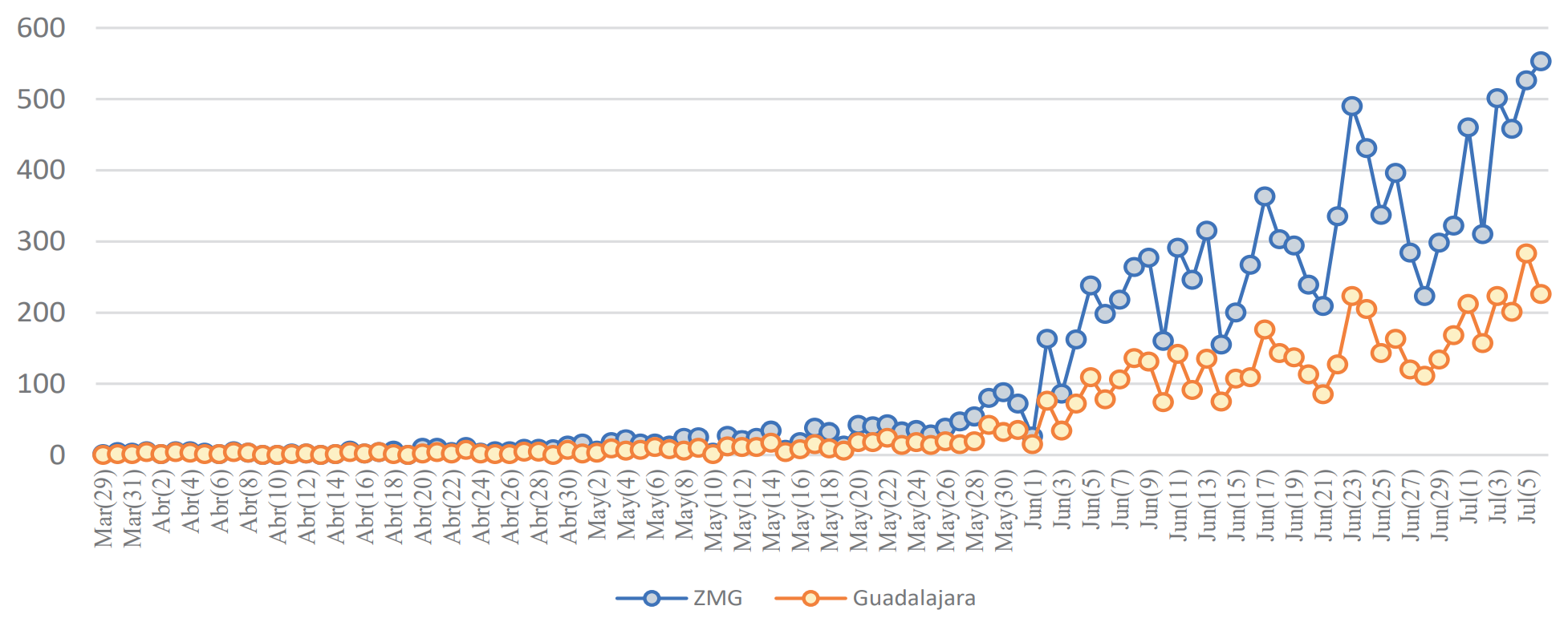 Las áreas metropolitanas en Guadalajara, Puerto Vallarta y, en menor medida, Ocotlán, son los que registraron el mayor número de casos en los primeros cuatro meses. La curva de contagios registró una tendencia creciente a partir del punto bajo del 10 de mayo, fecha en que se registraron tres casos en la metrópoli y solo uno en Guadalajara (SSJ, 2020). Desde entonces se alcanzaron máximos crecientes los días 13, 17 y 23 de junio, hasta llegar a los 553 casos en la zona, el día 6 de julio (ver gráfica 3).