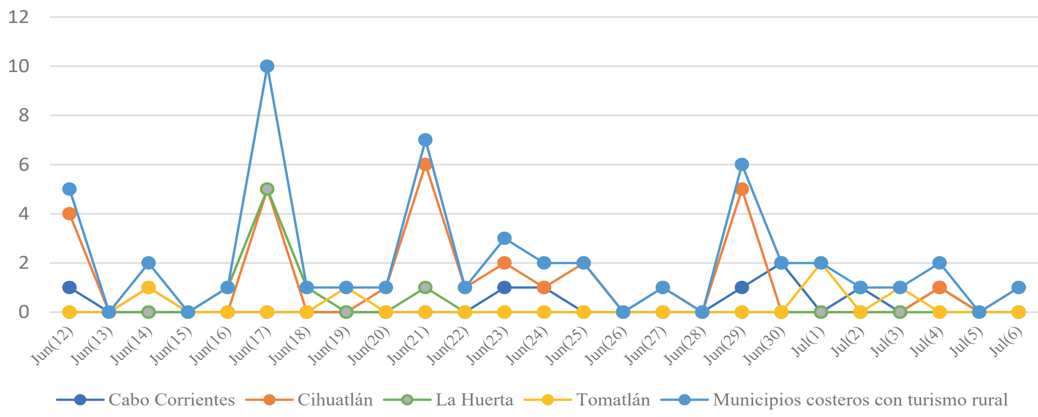 La pandemia del COVID-19 inició temprano en el grupo de cuatro municipios costeros de Jalisco que ofrecen turismo rural, pues Tomatlán tenía ya dos casos cuando comenzó el conteo por municipios, el 28 de marzo. El 17 de abril ese municipio registró un caso más. En los otros tres, los primeros casos se registraron el 13 de mayo en Cihuatlán, el 1 de junio en La Huerta, y el 12 de junio en Cabo Corrientes (El Tuito). A partir de entonces, la tendencia de contagios diarios de este grupo empezó a ser dominada por el municipio de Cihuatlán, que tuvo picos de cinco, seis y cinco casos diarios los días 17, 21 y 29 de junio, respectivamente (gráfica 6).