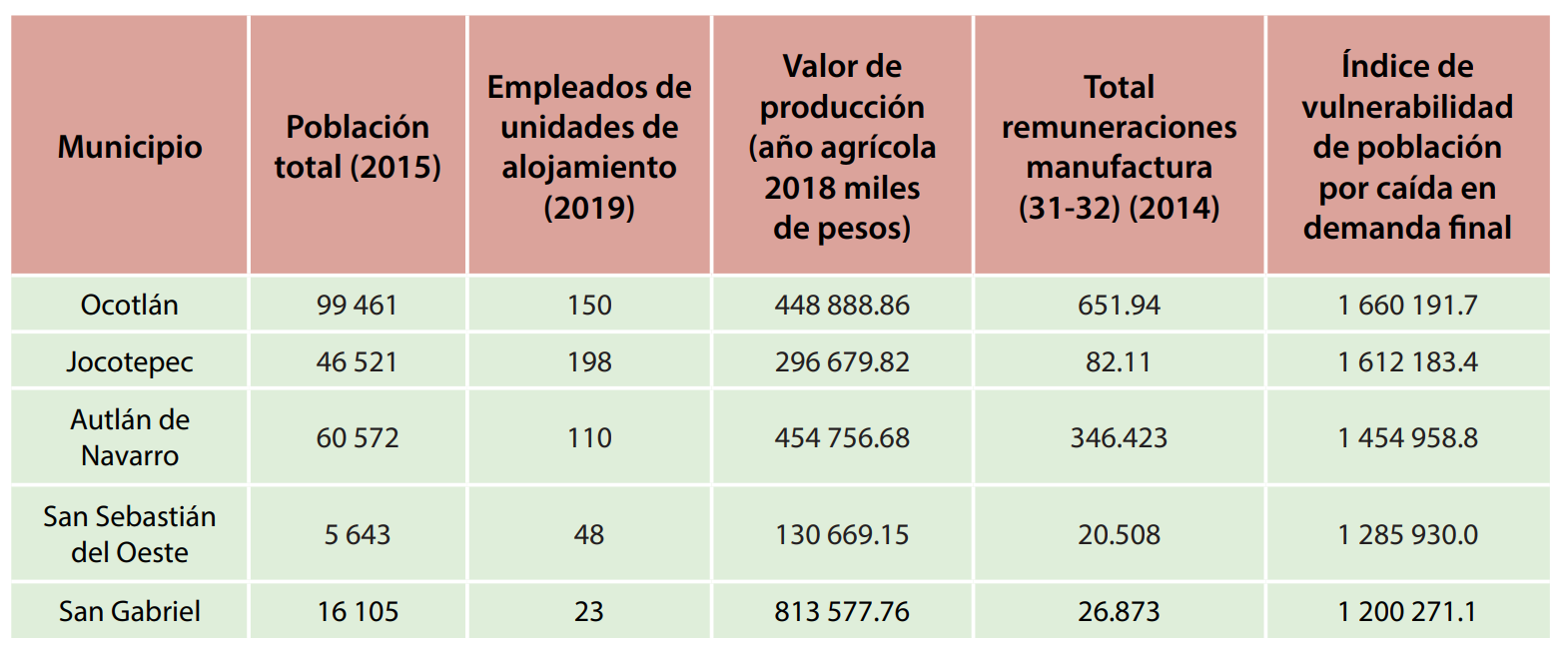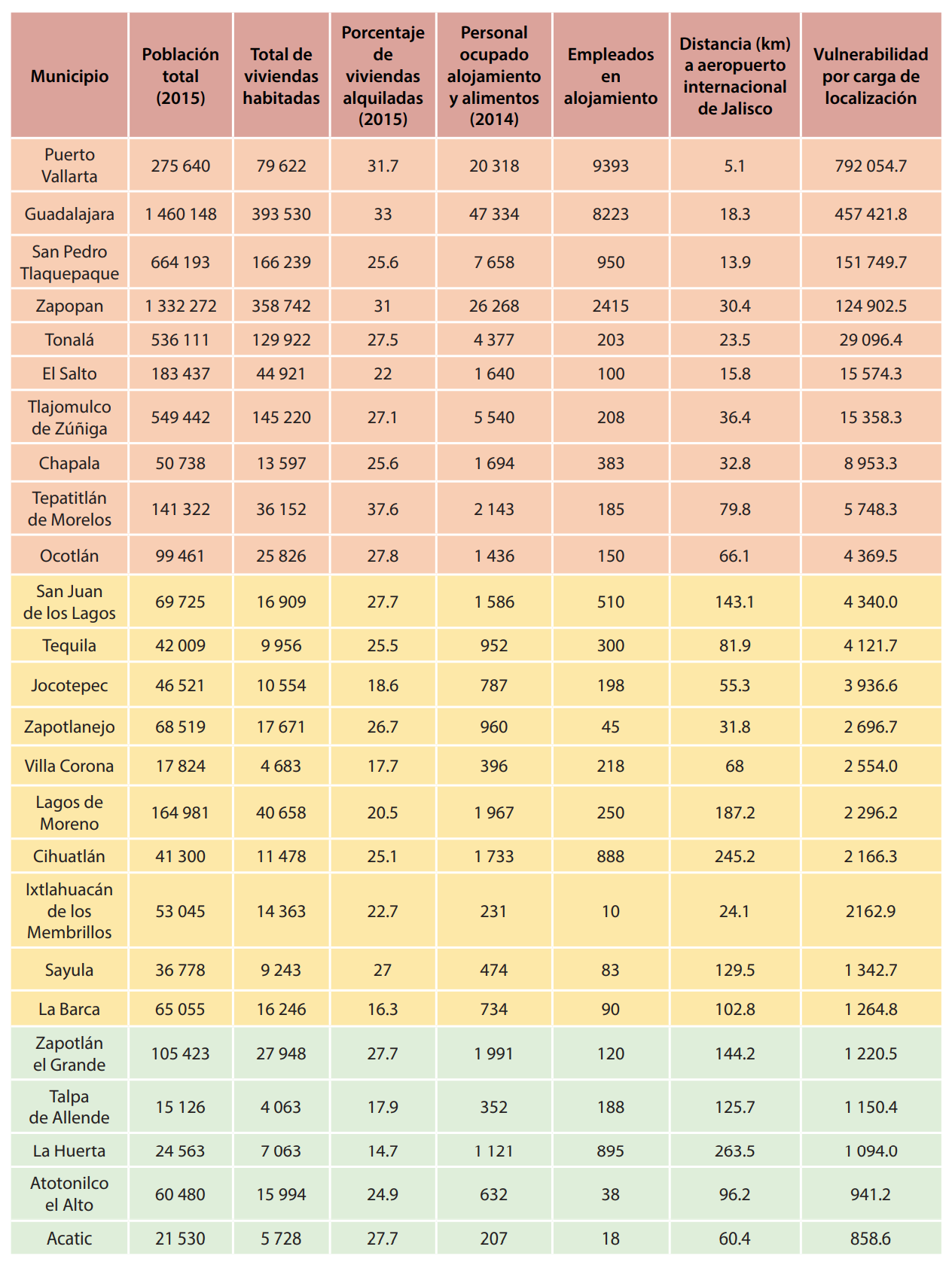 Entre los primeros diez lugares de vulnerabilidad se encuentran tres municipios con declaratoria de Pueblos Mágicos (Tlaquepaque, Mazamitla y Tapalpa), dos municipios de la costa sur de Jalisco (Cihuatlán y la Huerta), el principal destino de turismo religioso (San Juan de los Lagos) y Arandas como ciudad media con una importante tradición tequilera. En los siguientes diez lugares se localizan otros pueblos mágicos (Lagos de Moreno, Talpa de Allende, Mascota y Tequila), y lugares de balnearios y recreo familiar cercanos a Guadalajara, como Chapala y Villa Corona.