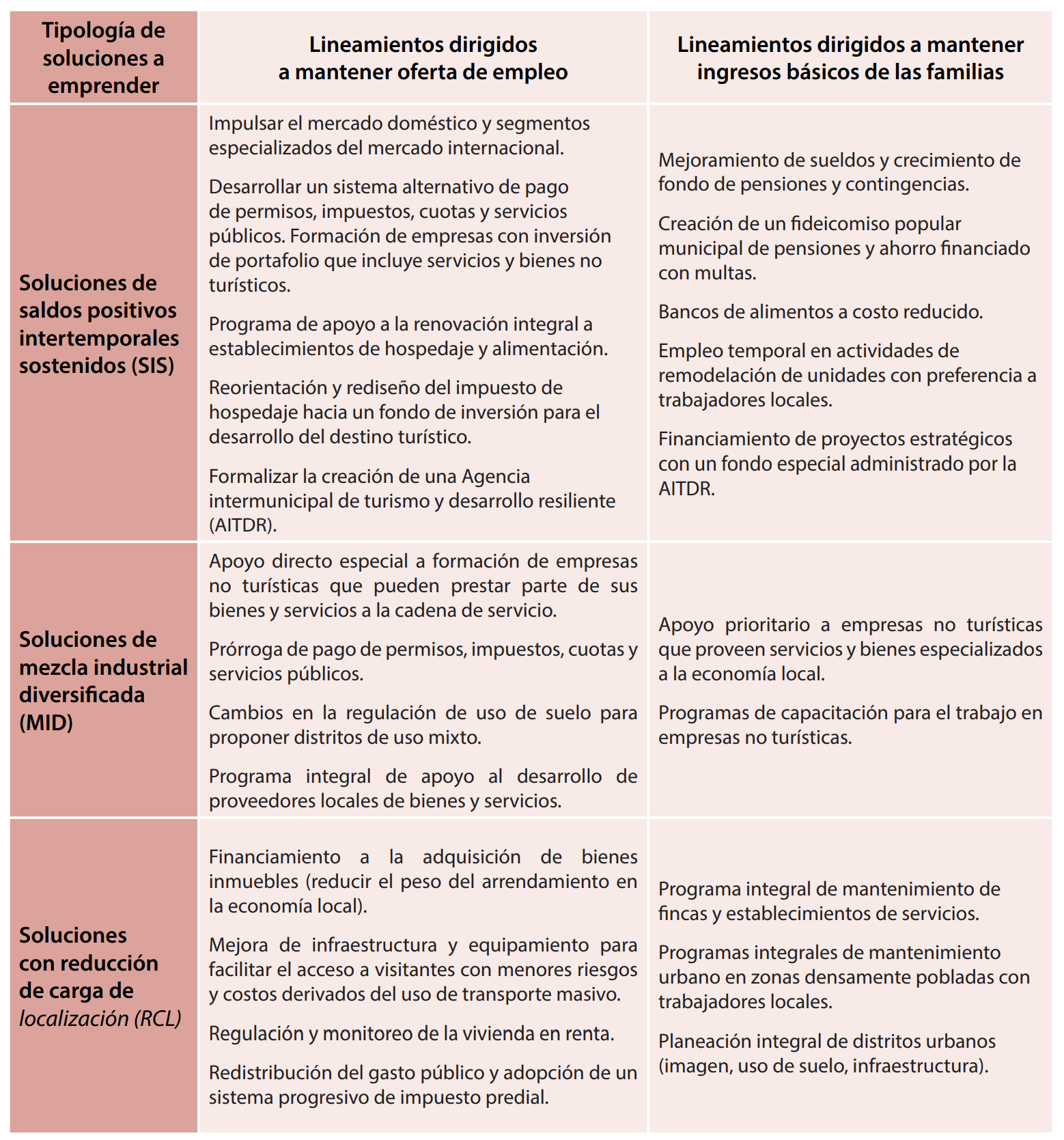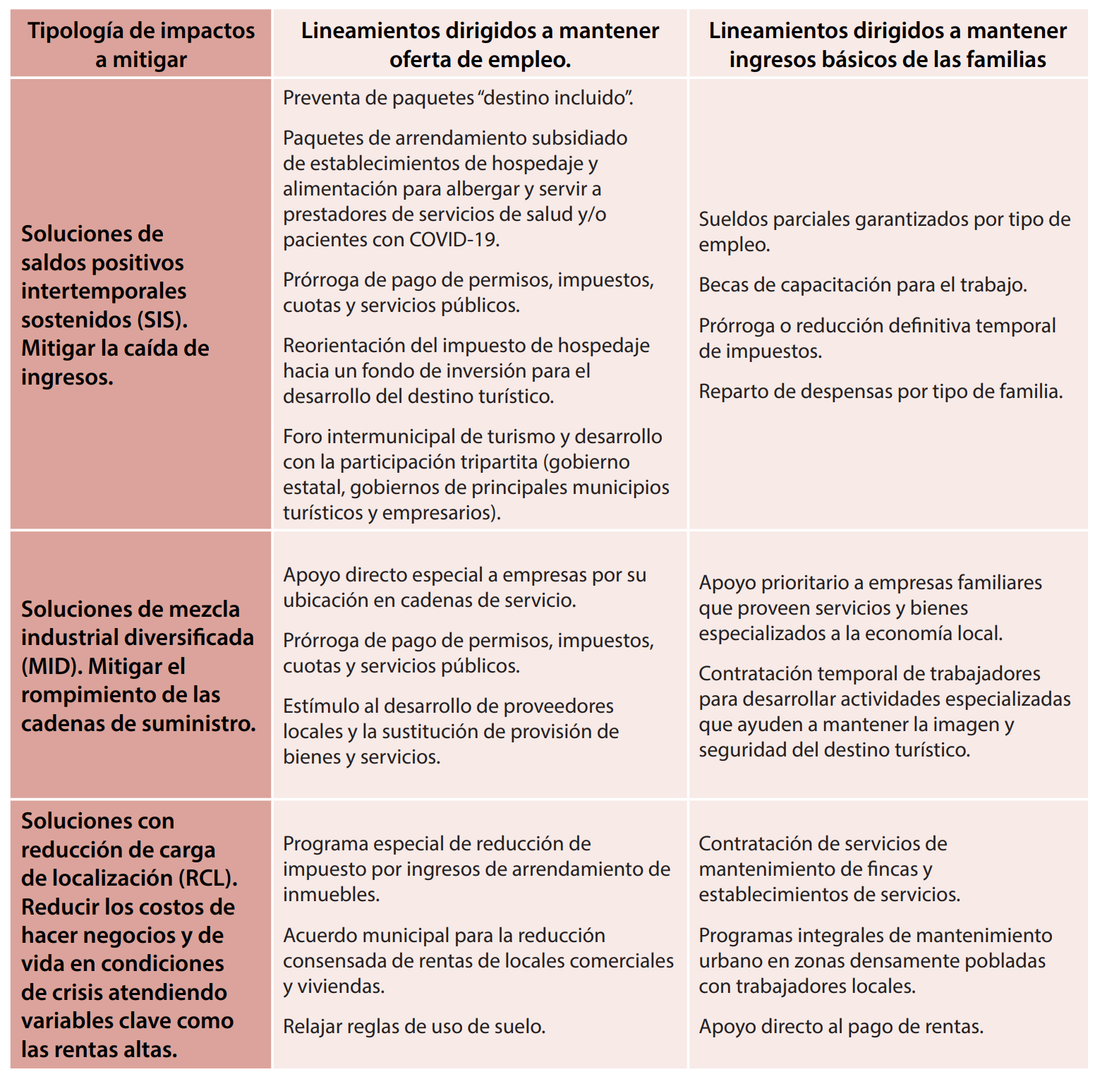 El objetivo central es crear una economía turística local resiliente. Tanto al diseñar apoyos a empresas o directos a población, es necesario considerar que la imagen y competitividad del destino turístico dependen de: a) un manejo integral de la imagen. No dejar caer ni un barrio; b) una estructura funcional de bienes y servicios. No dejar que desaparezca ningún servicio esencial para la competitividad; y, c) una fuerza de trabajo calificada. No dejar que emigre el personal calificado indispensable para el sector. A fin de lograr lo anterior, se necesita el uso intensivo de información sobre empresas, condiciones y contextos en los que operan.