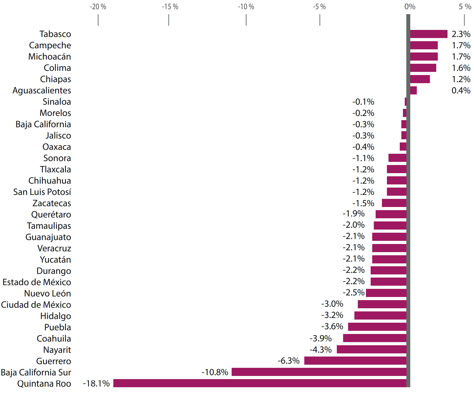A nivel nacional, Quintana Roo es el estado que más impacto ha sufrido en materia de pérdida de empleo, seguido por otras dos entidades eminentemente turísticas: Baja California Sur y Guerrero (ver gráfica 1), por lo que su variación en esta variable durante el periodo de abril 2019-2020, es de 18.1%, 10.8% y 6.3% respectivamente, aunque se reitera que solo se establecen los datos del empleo formal, a nivel nacional la informalidad laboral es del 56%.