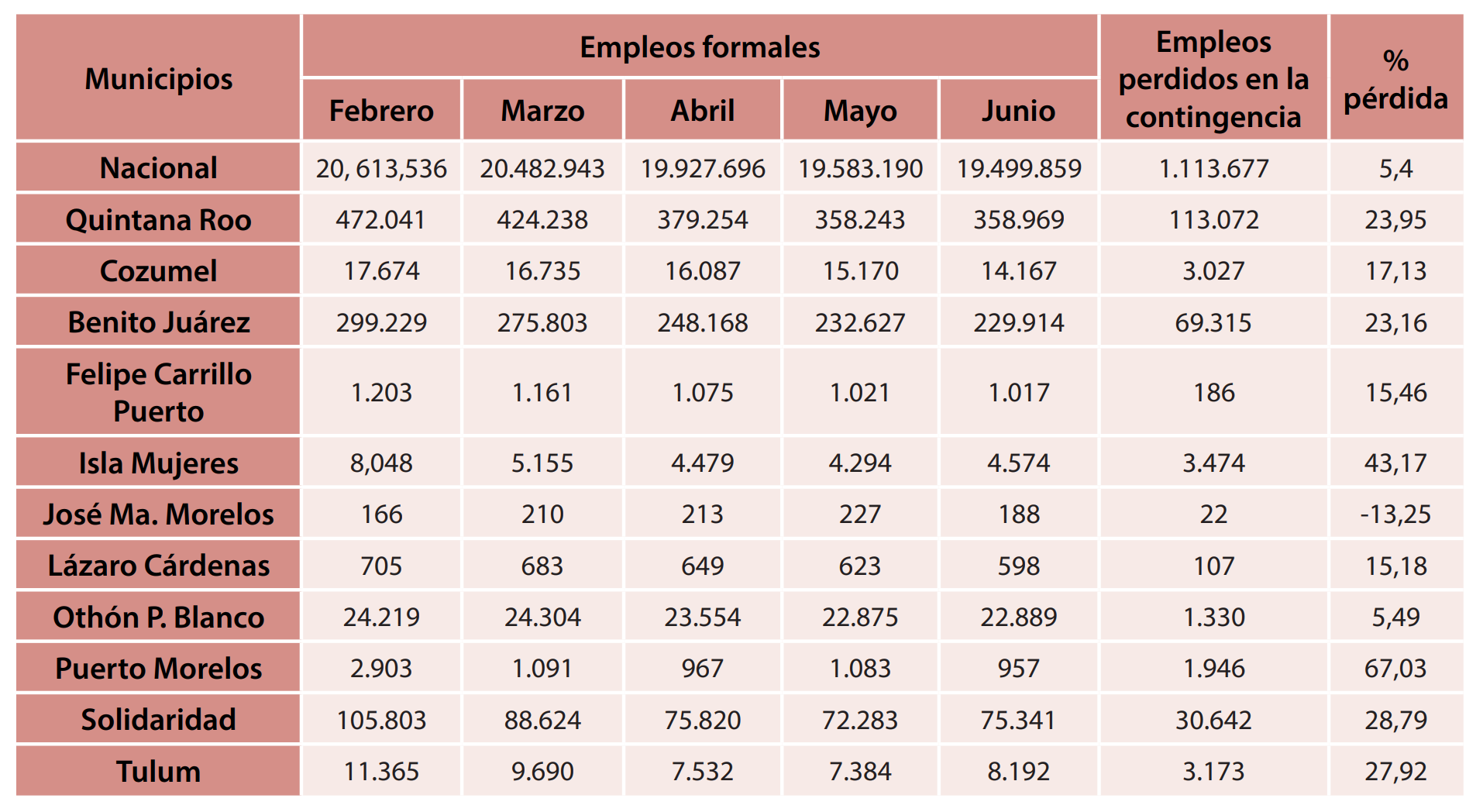 Los resultados en materia de pérdida de empleos formales en la entidad son trágicos. A nivel nacional se han esfumado más de 600 mil empleos, lo que representa una disminución del 3%. A nivel estatal la cifra sube hasta el 24.11%; no obstante, la pérdida de empleo en el sector turístico es aún más alarmante que ese porcentaje, pues, al desagregar las cifras estatales, se puede observar el fenómeno agravado en las zonas dedicadas al turismo: Isla Mujeres ha perdido el 46.65% de sus empleos, Playa del Carmen 31.68%, Tulum 35.03% y el nuevo municipio de Puerto Morelos el 62.69% (ver tabla 2).