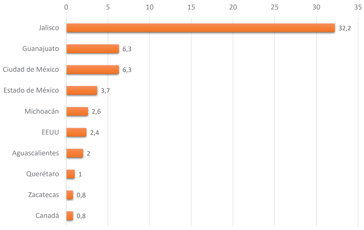 La gráfica 1 ilustra asimismo el hecho de que la clientela turística de Colima es esencialmente regional, con la gran mayoría proveniente de los estados vecinos de Jalisco y Michoacán, del centro del país y de la zona del Bajío, con una reducida proporción de visitantes extranjeros de los Estados Unidos de América y de Canadá. El resto de las respuestas se dispersan entre las diversas entidades federativas del país en forma poco representativa.