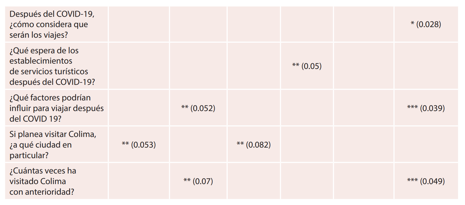 La información recopilada arrojó datos respecto al perfil sociodemográfico de la clientela turística del destino Colima, sus hábitos de viaje y expectativas pospandemia. El Análisis de Correspondencias (AC) permitió establecer correlaciones entre diversas variables del perfil sociodemográfico y los hábitos de viaje de la muestra encuestada. Desde el punto de vista de la rivalidad de destinos turísticos, se logró ubicar el posicionamiento de Colima frente a otros competidores, en función de un conjunto de indicadores básicos. En términos de literatura académica, el documento se apoya igualmente en fundamentos relacionados con el perfil sociodemográfico del turista, hábitos de viaje, la segmentación de mercados y la competitividad de los destinos.
