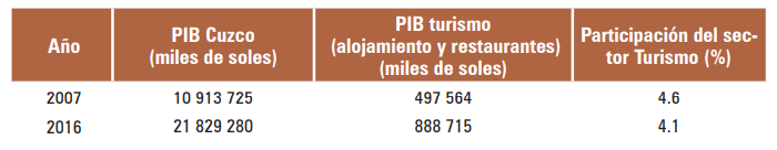 Cuadro 2. Contribución del sector turismo al PIB del Departamento de Cuzco, 2007 y 2016