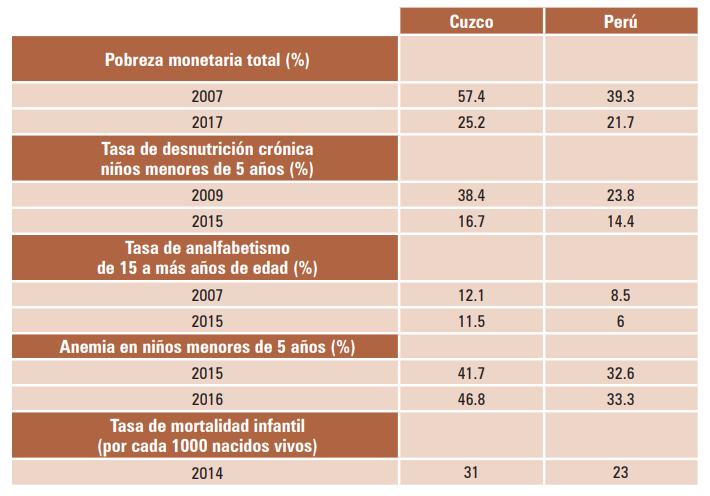 A pesar del espectacular crecimiento económico de la región, Cuzco presenta aún graves problemas de desarrollo. Aunque en la última década se han logrado avances en la reducción de la pobreza. Según los datos del INEI que muestra el cuadro 3, la pobreza se redujo de 54.2% en 2007 a 25.2% en 2017. No obstante, estos valores superan el promedio nacional. Además, la distribución de la pobreza muestra contrastes muy marcados, la capital regional y alrededores presentan menor incidencia de la pobreza que las zonas altas y montañosas. Según el Mapa de pobreza provincial y distrital 2013, elaborado por el INEI (2015), el distrito de Wanchaq, en la provincia de Cuzco, es el menos pobre de la región inferior al 0.9%, mientras que, por ejemplo, en la zona de Paucartambo, la pobreza es mayor al 30%. Es decir, la pobreza se concentra en las zonas rurales y montañosas, y el desarrollo en las ciudades o zonas urbanas.