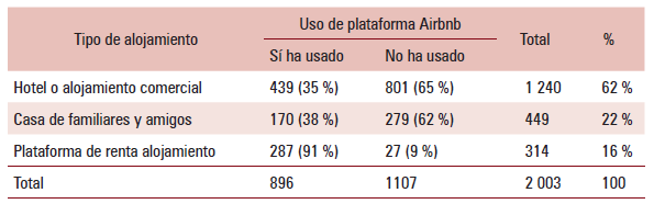 Llama la atención que los turistas alojados en casa de familiares y amigos presenta mayor participación (22 %) que los usuarios de la plataforma. Dicho porcentaje es mayor que en otros estudios (Sosa, Martínez, Moncada, Beltrán y Álvarez, 2015) que analizaron el segmento de visitas a familiares y amigos (cuadro 2). También destaca la nula experiencia en el uso de la plataforma, tanto entre quienes se hospedaron en alojamiento comercial como en casa de familiares y amigos, con porcentajes superiores al 60 % (cuadro 2). Incluso, se detectaron 27 nuevos usuarios de alojamiento por plataforma que lo harían por primera vez en Cancún, lo que indica que se trata aún de una modalidad en crecimiento.