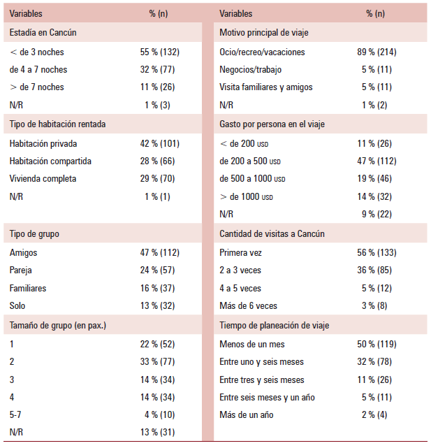 Estas dos preguntas se hicieron a 2 003 turistas alojados en Cancún, bajo un muestreo aleatorio simple, realizado en trece lugares de levantamiento, los cuales cubrieron la zona hotelera, el centro urbano de Cancún e Isla Mujeres, reconocidos por Airbnb como Cancún. De este modo se intentó obtener la proporción de turistas de Cancún que son usuarios de plataformas de alojamiento. Sin embargo, la cantidad de entrevistas no fue proporcional en las tres zonas turísticas, existió un predominio de las realizadas en la zona Centro de Cancún (71 %). Por esta razón, los resultados no pueden extrapolarse al total de turistas de Cancún. Además, el número de entrevistas efectuadas a usuarios de Airbnb fue de 238, cantidad menor al tamaño fijado como muestra, que, no obstante, otorga al levantamiento un carácter de sondeo y genera valiosa información sobre este segmento de turistas desconocido hasta el momento.